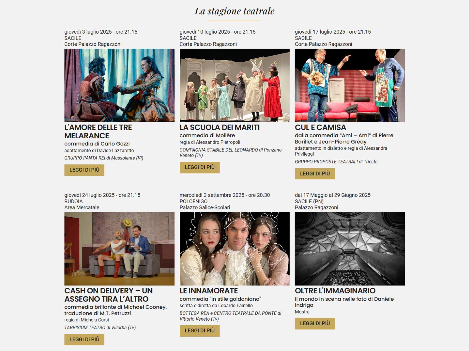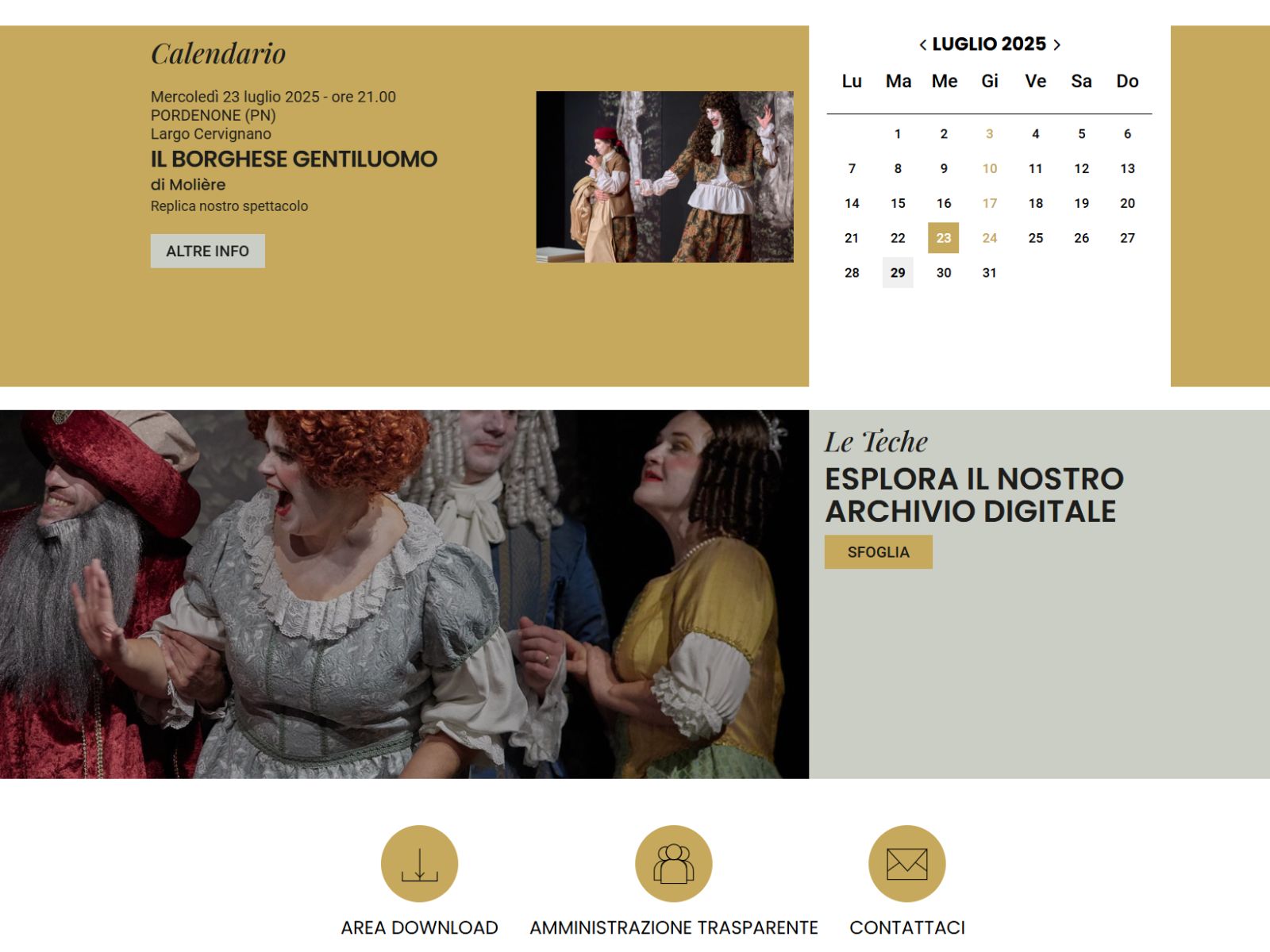 Il portale si distingue per un progetto grafico unitario e dedicato, studiato per restituire online l’identità del Piccolo Teatro di Sacile in modo coerente, elegante e accessibile. L’interfaccia è pensata per accompagnare il visitatore attraverso la doppia anima del teatro: quella storica, custodita e raccontata attraverso l’archivio, e quella contemporanea, rappresentata dalla programmazione artistica, dalle collaborazioni e dagli eventi in corso.